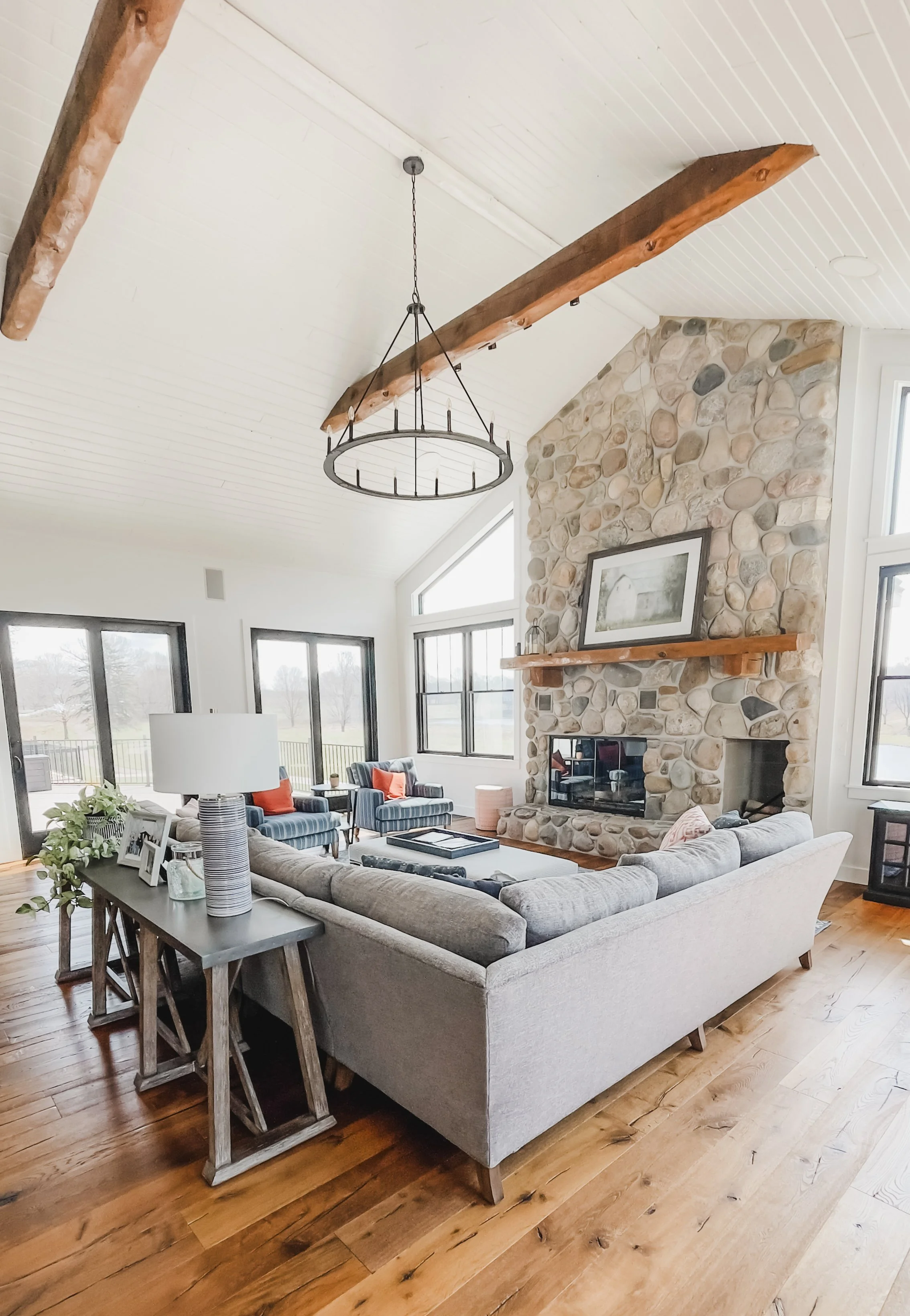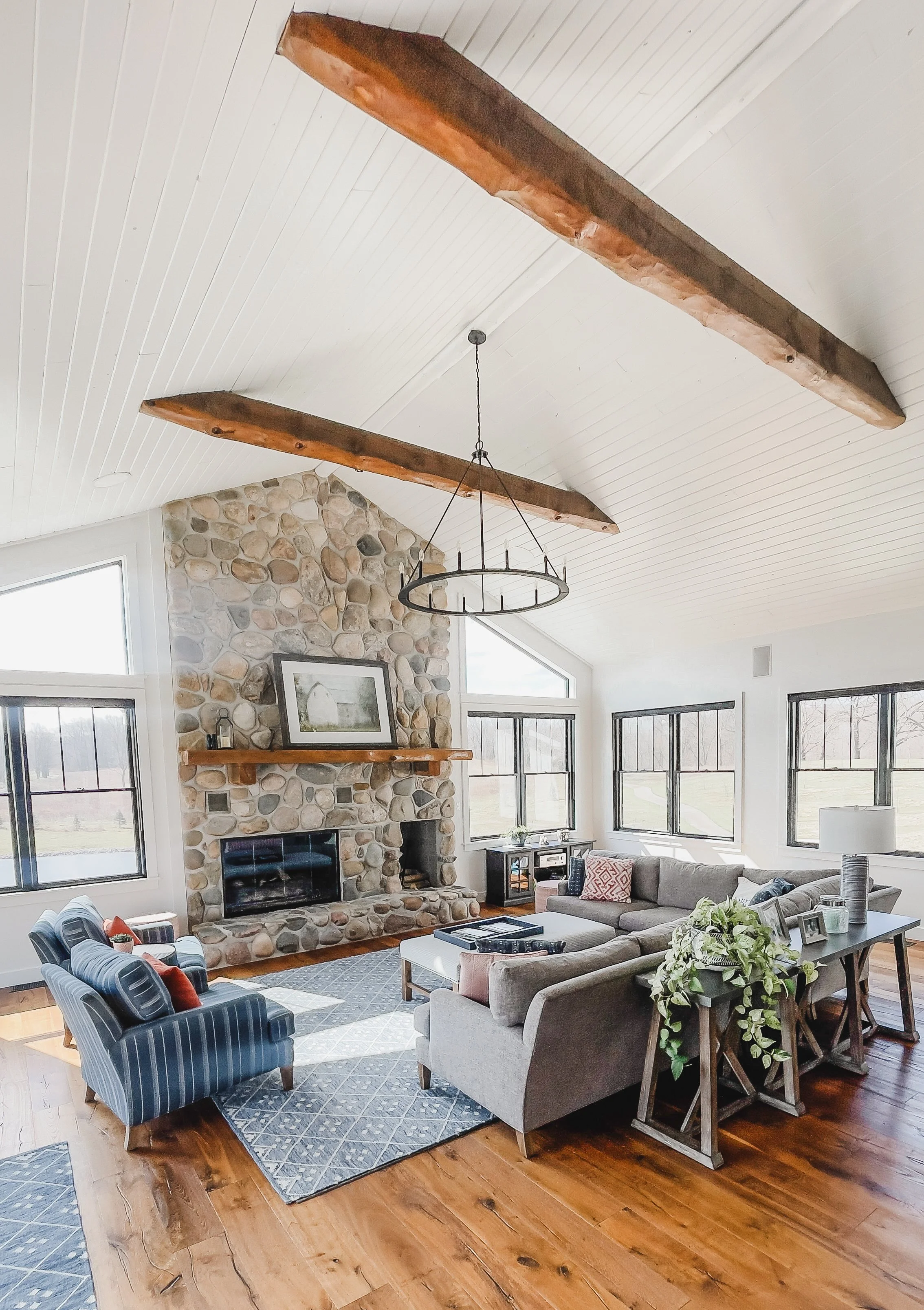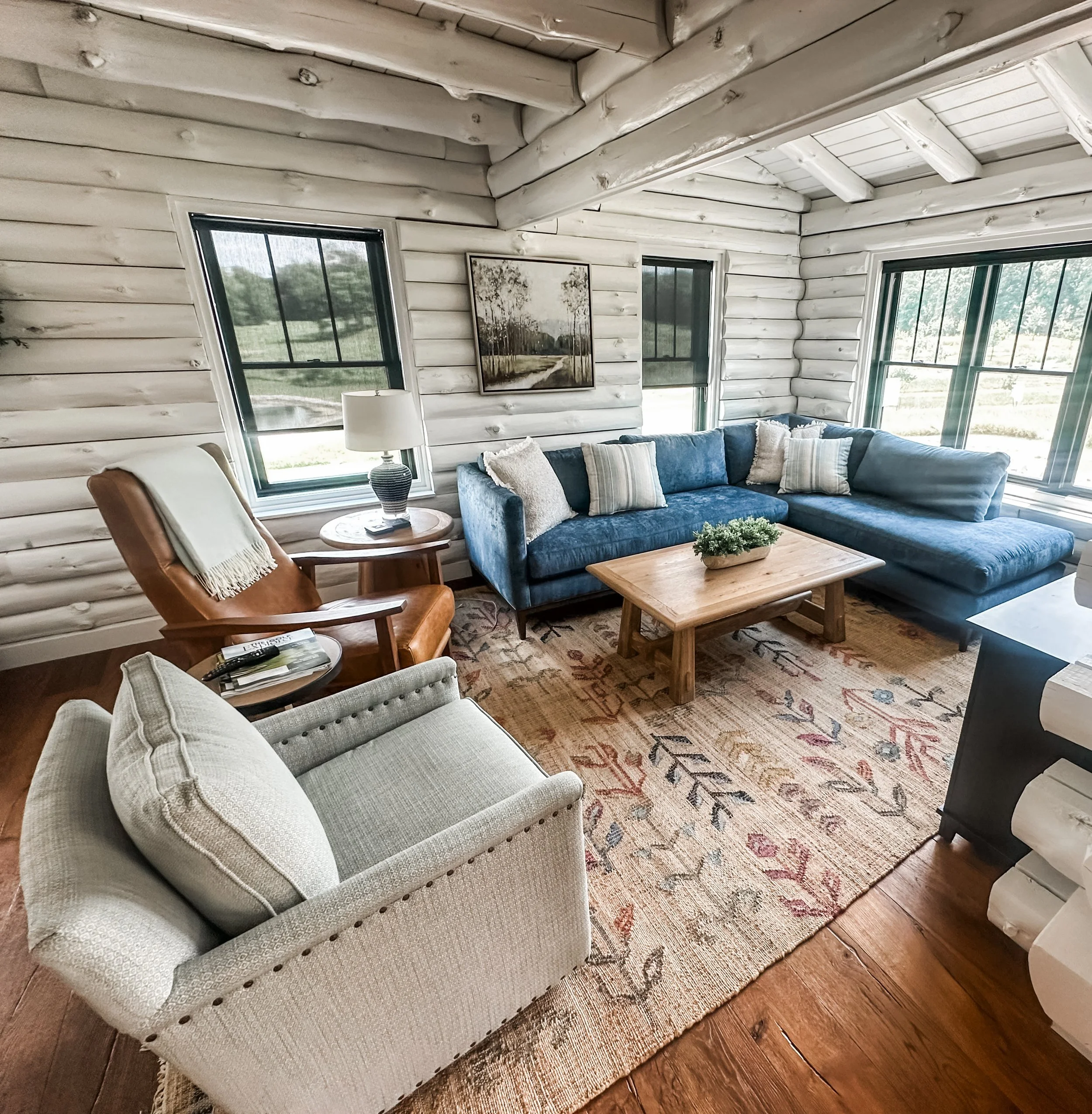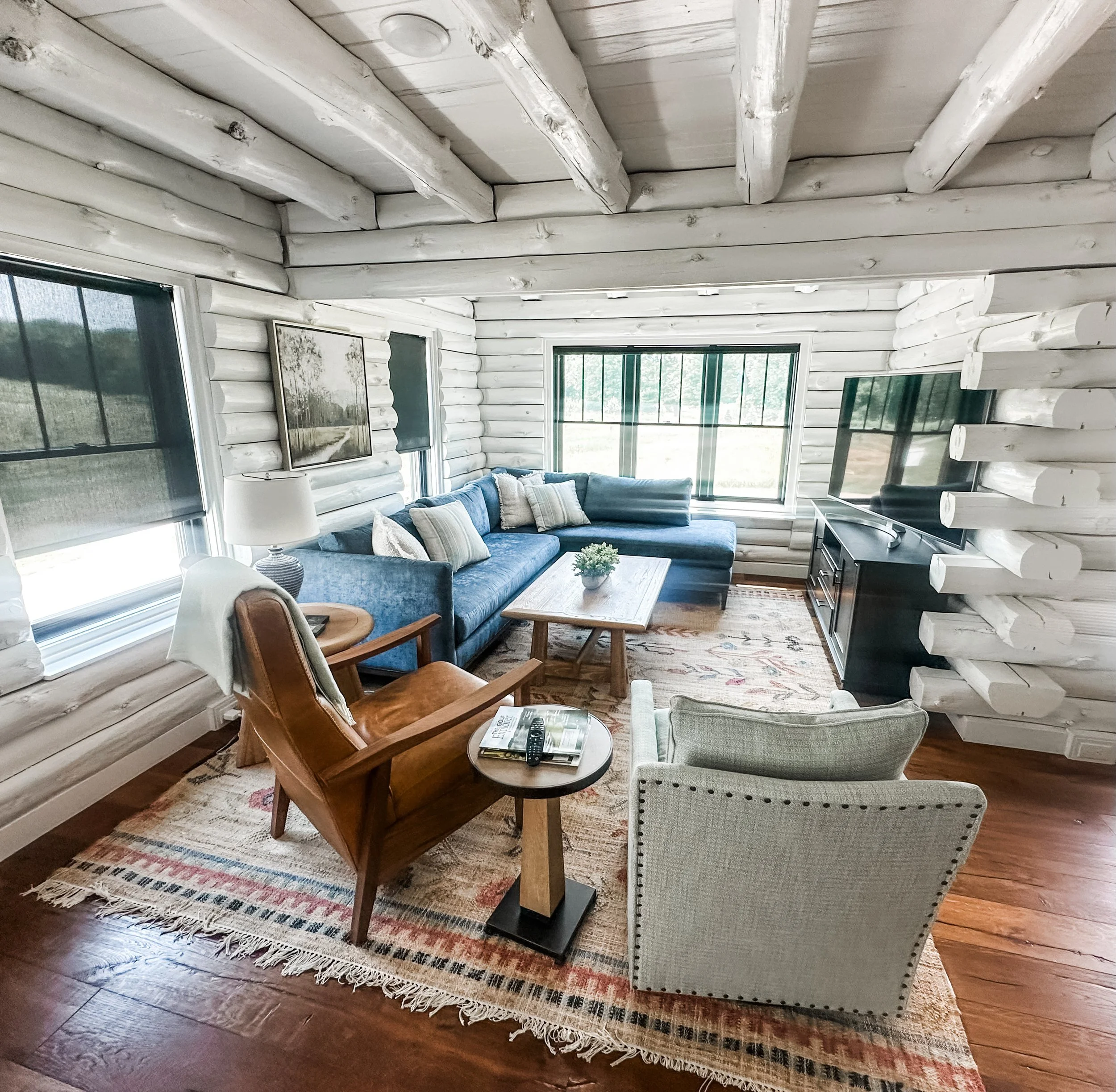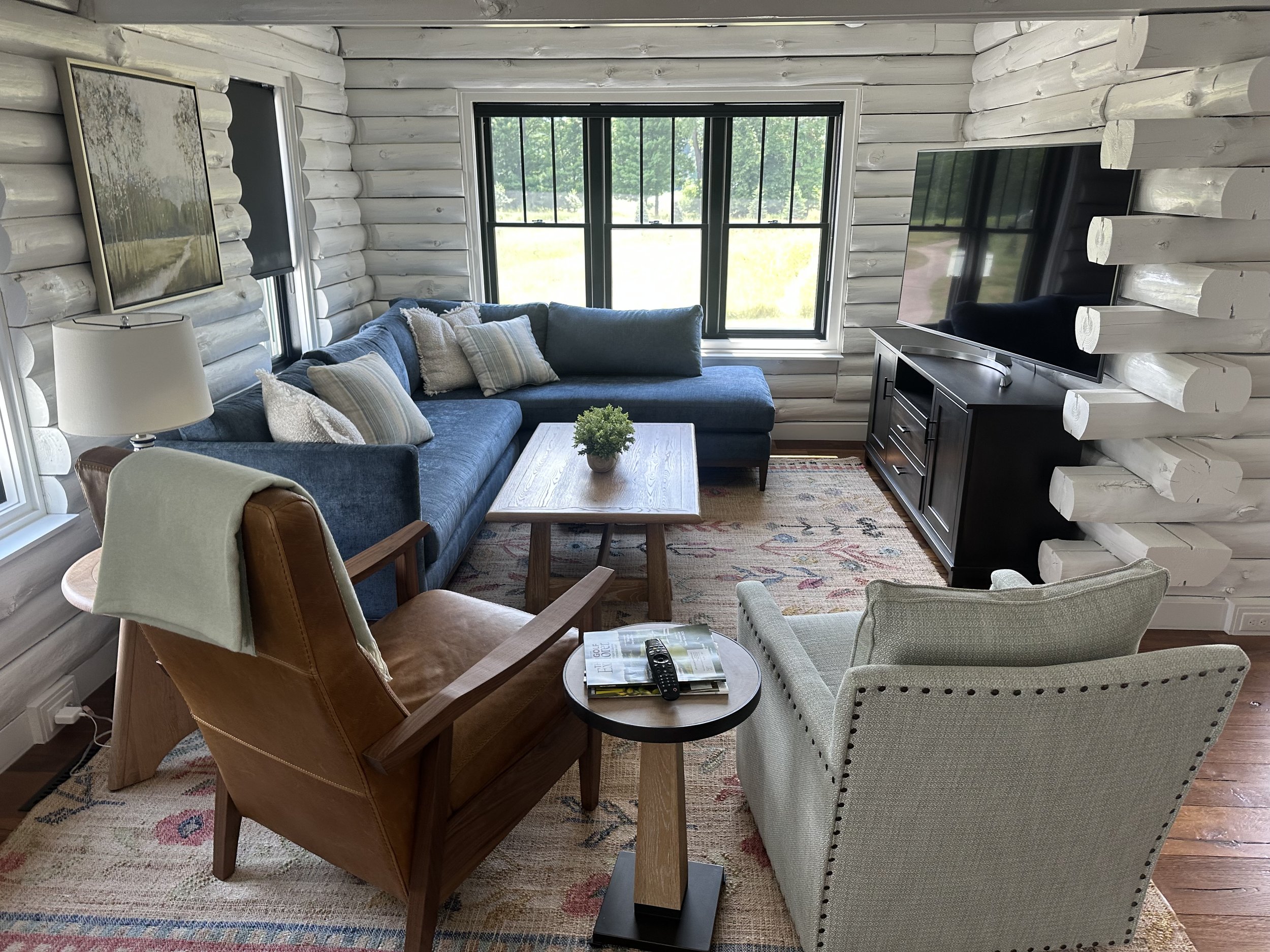 The clients created a beautiful modern farmhouse foundation for their white-painted log cabin, and I partnered with them to help bring the home to life. Our goal was to make the space feel warm and welcoming while furnishing it with high-end pieces durable enough for a busy family.