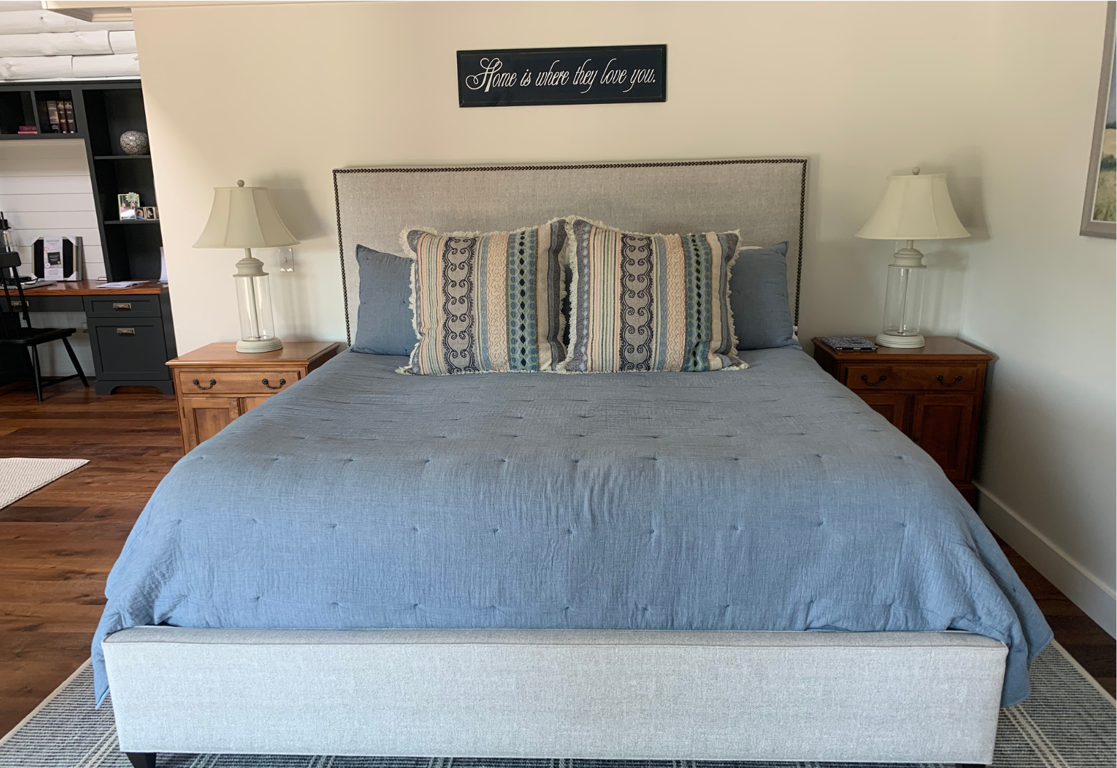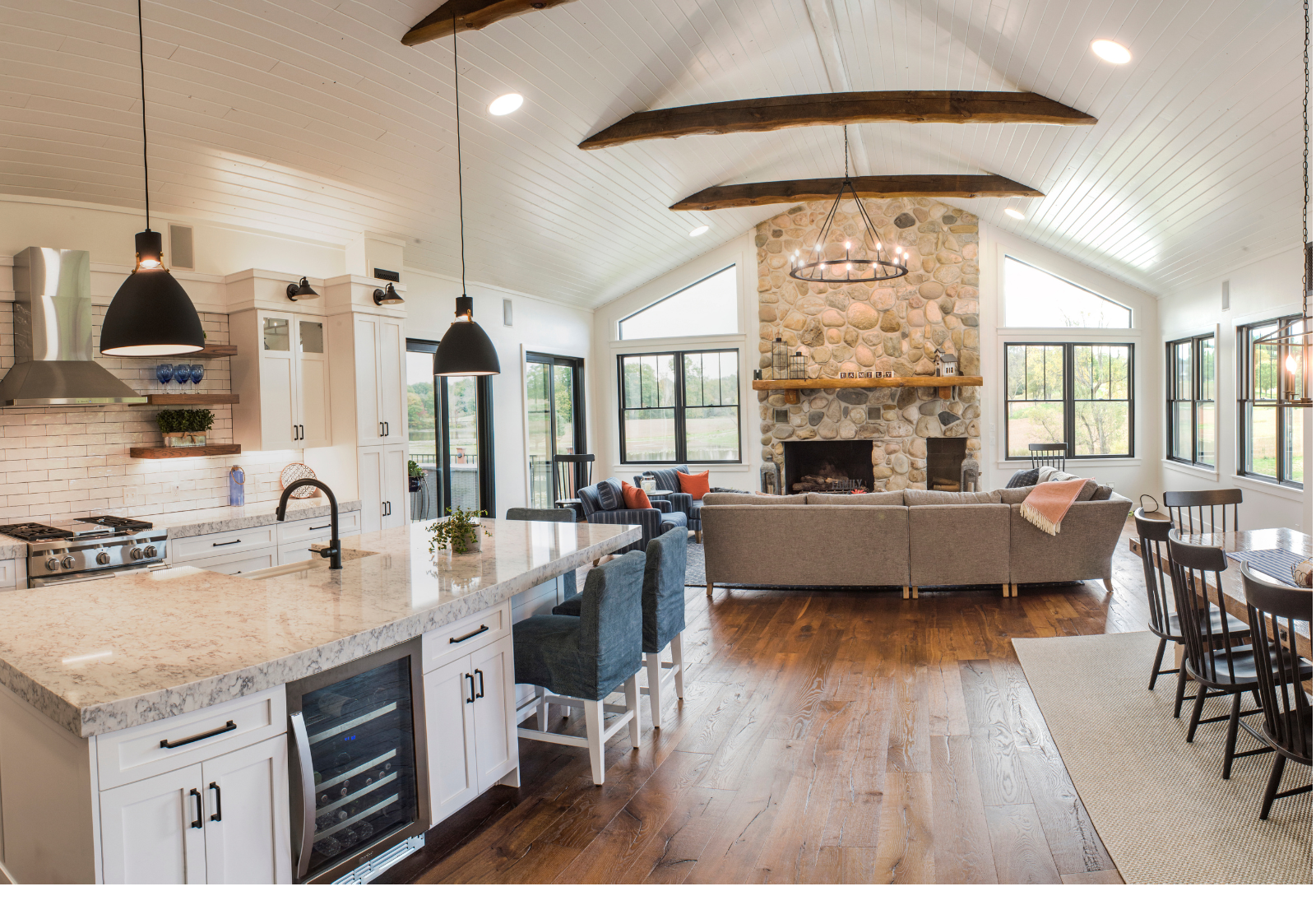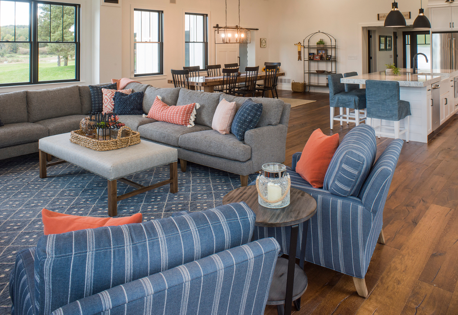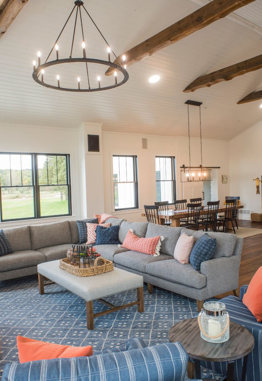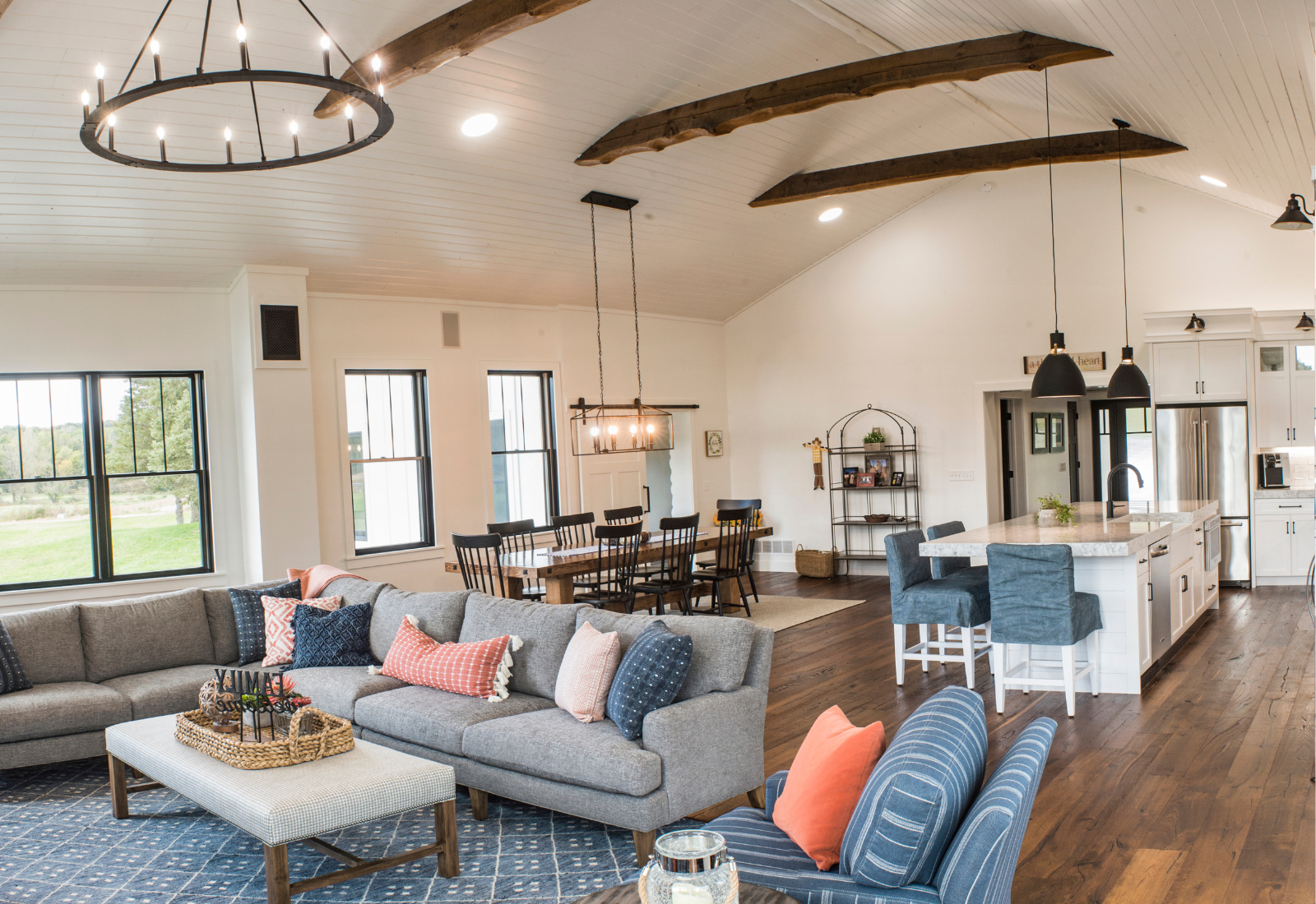 The clients created a beautiful modern farmhouse foundation for their white-painted log cabin, and I partnered with them to help bring the home to life. Our goal was to make the space feel warm and welcoming while furnishing it with high-end pieces durable enough for a busy family.